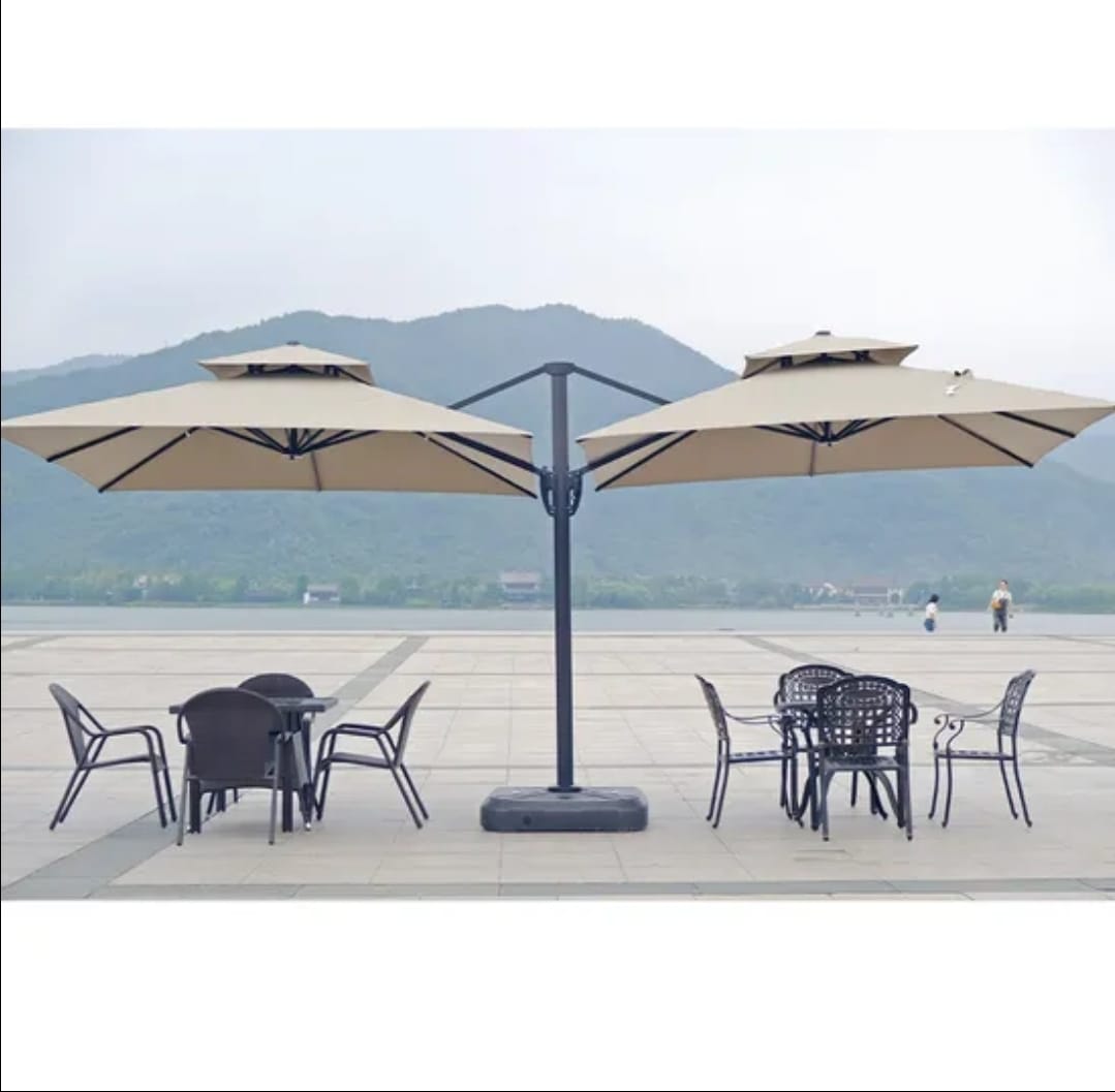 Offset side pole keeps the area under the canopy completely clear, so you can place tables, loungers, or walkways without a central post in the way.The square canopy and clean lines create a very contemporary look that suits resorts, cafes, and high‑end residential terraces.A heavy, low‑profile base anchors the mast to resist tipping and allows installation on wooden decks, concrete, or paving.